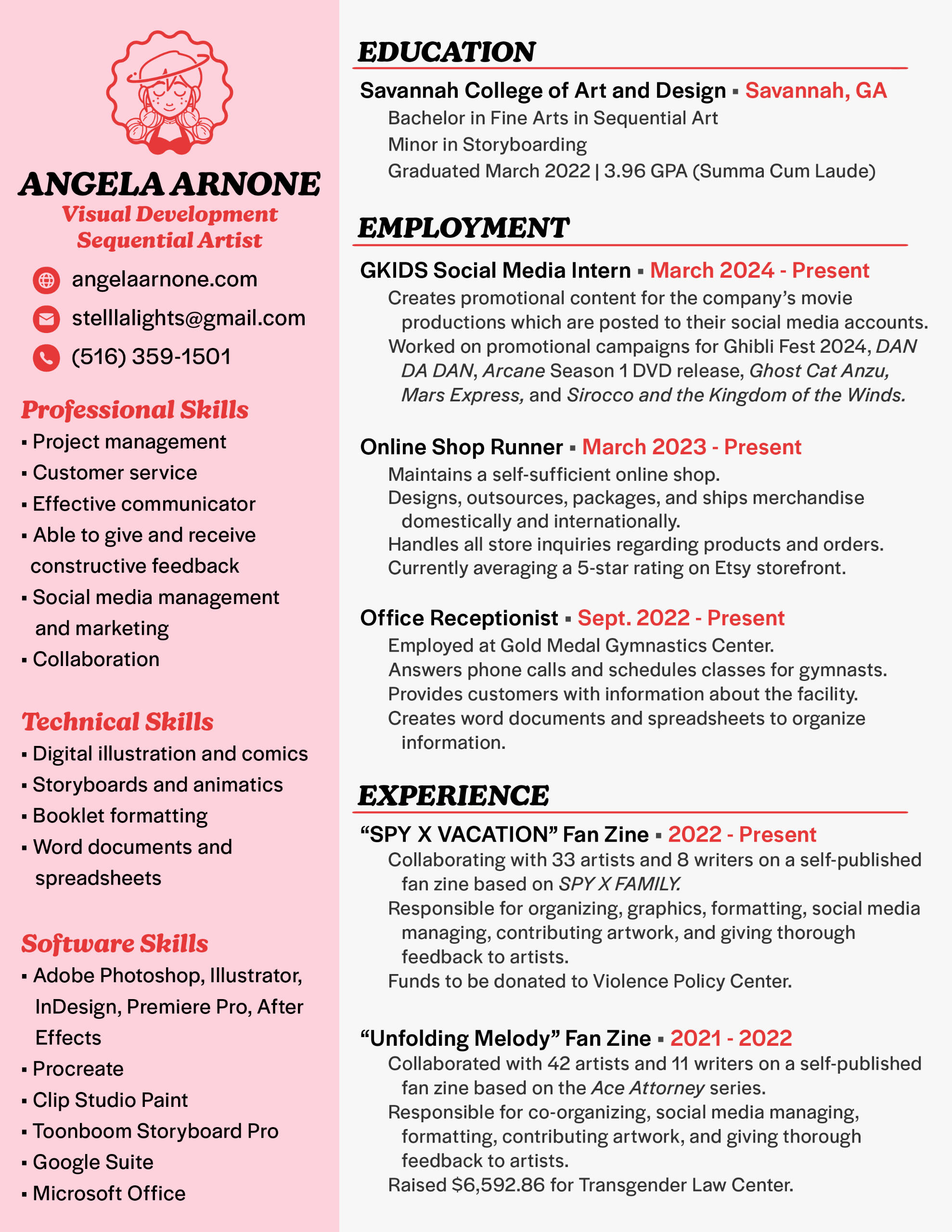 Hi! I'm Angela Arnone, and I'm a 25 year old graduate from Savannah College of Art and Design. I have a BFA in Sequential Art with a Storyboarding minor, and I am interested in storyboarding and character design for TV Animation. I am heavily involved in several charity zine projects, both as an organizer and as a contributor, and I enjoy working and collaborating with teams of creators. I have even raised a total of over $32,000 from previous charity zines. In my free time, I've been exploring other areas of art such as graphic design, but I also enjoy watching cartoons and playing video games!